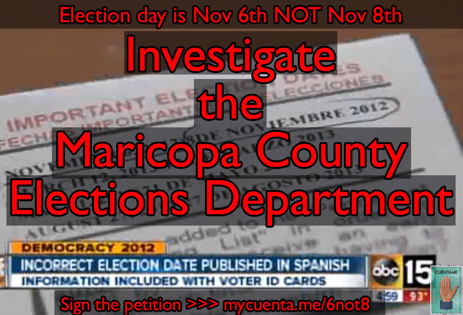 Sign the petition to demand an investigation of the Maricopa County Elections Department! This is a blatant attack on the voter rights of Latinos in Maricopa County. If the Elections Department falls short in admitting that this is fraud, they must at least be investigated for these detrimental mistakes!
